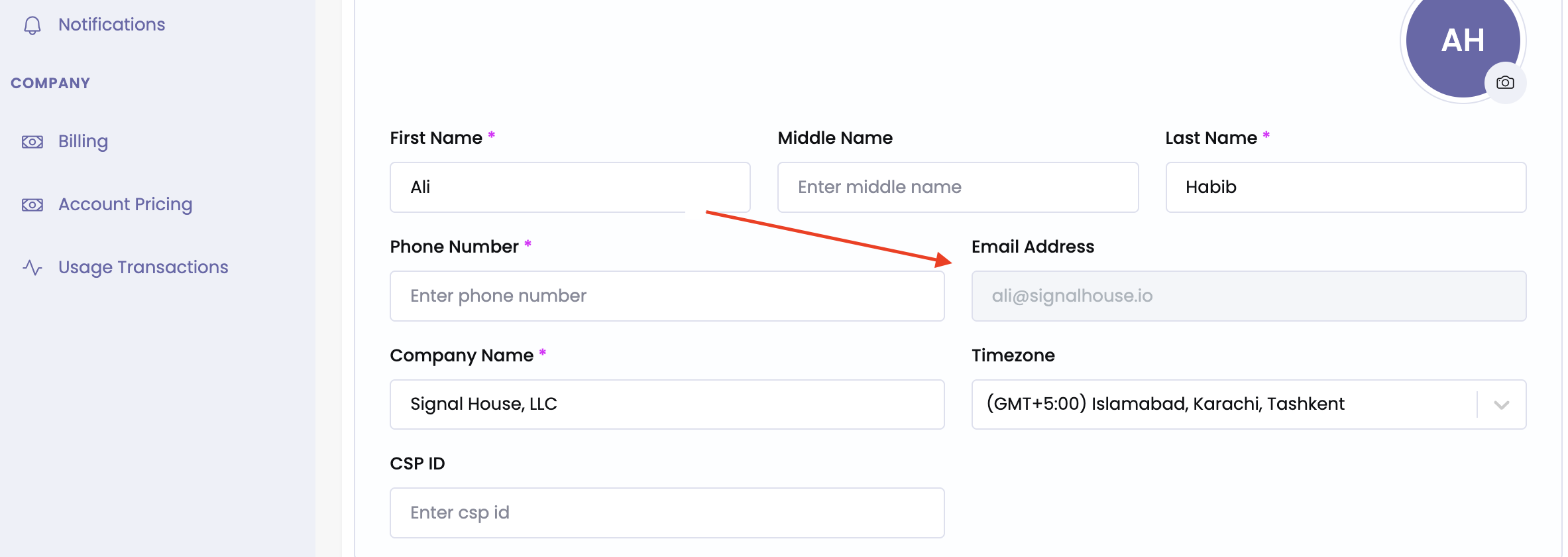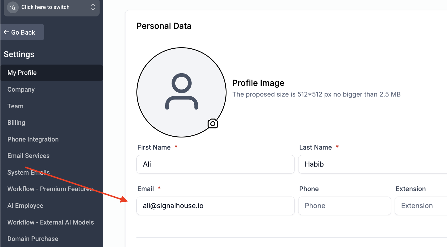 The key here is that you should be signed in with the same email on GHL as the one on the Signal House portal. For instance, the email on the Signal House portal for a user (by portal, we mean app.signalhouse.io) is: