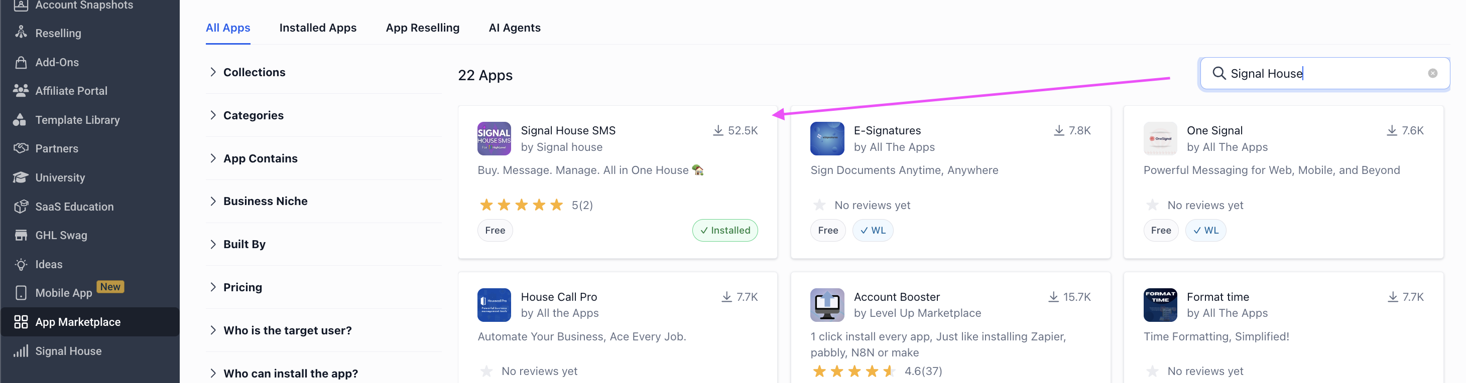 To install the Signal House app make sure you are on the agency view not the sub account on GHL. Go on Agency View > App Marketplace > type Signal House and you'll see the app appearing just like here: