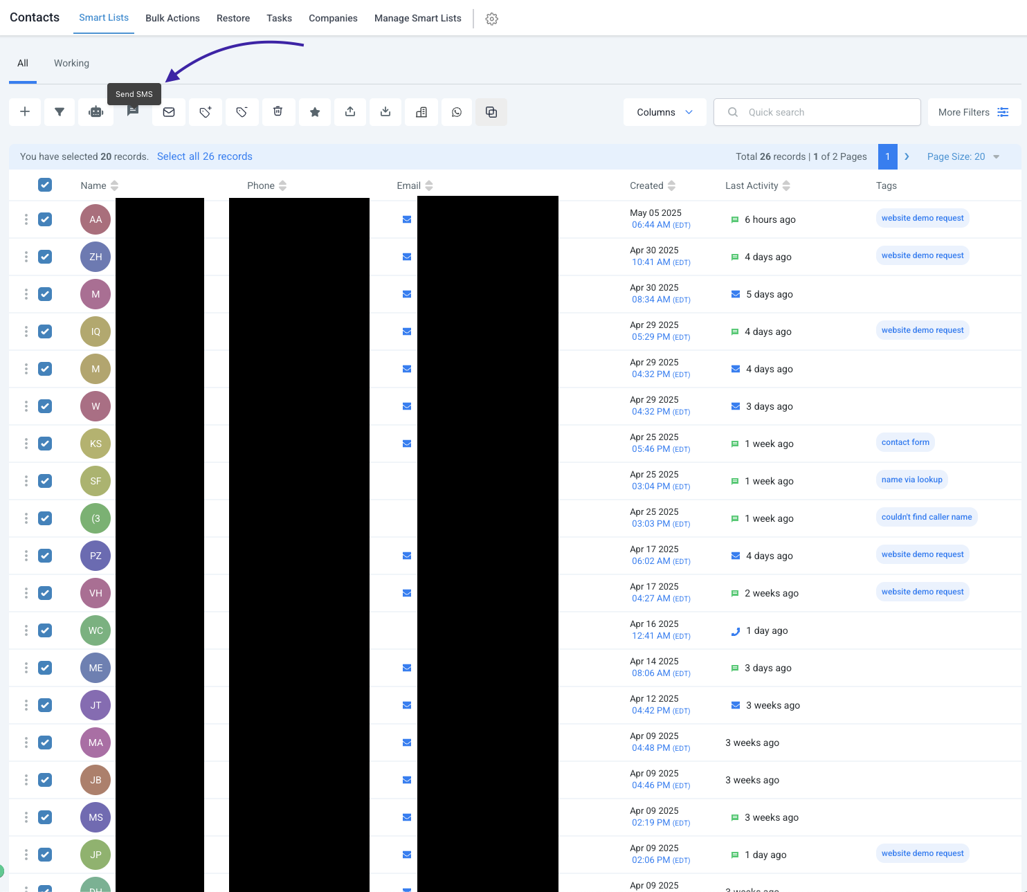 Send SMS | Contacts β Open a contact β Click βSend SMSβ |