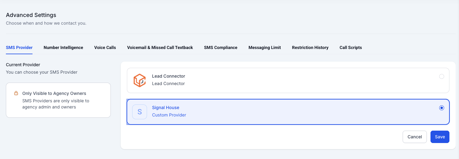 Default Provider | Set Signal House as the SMS engine for all GHL communications |