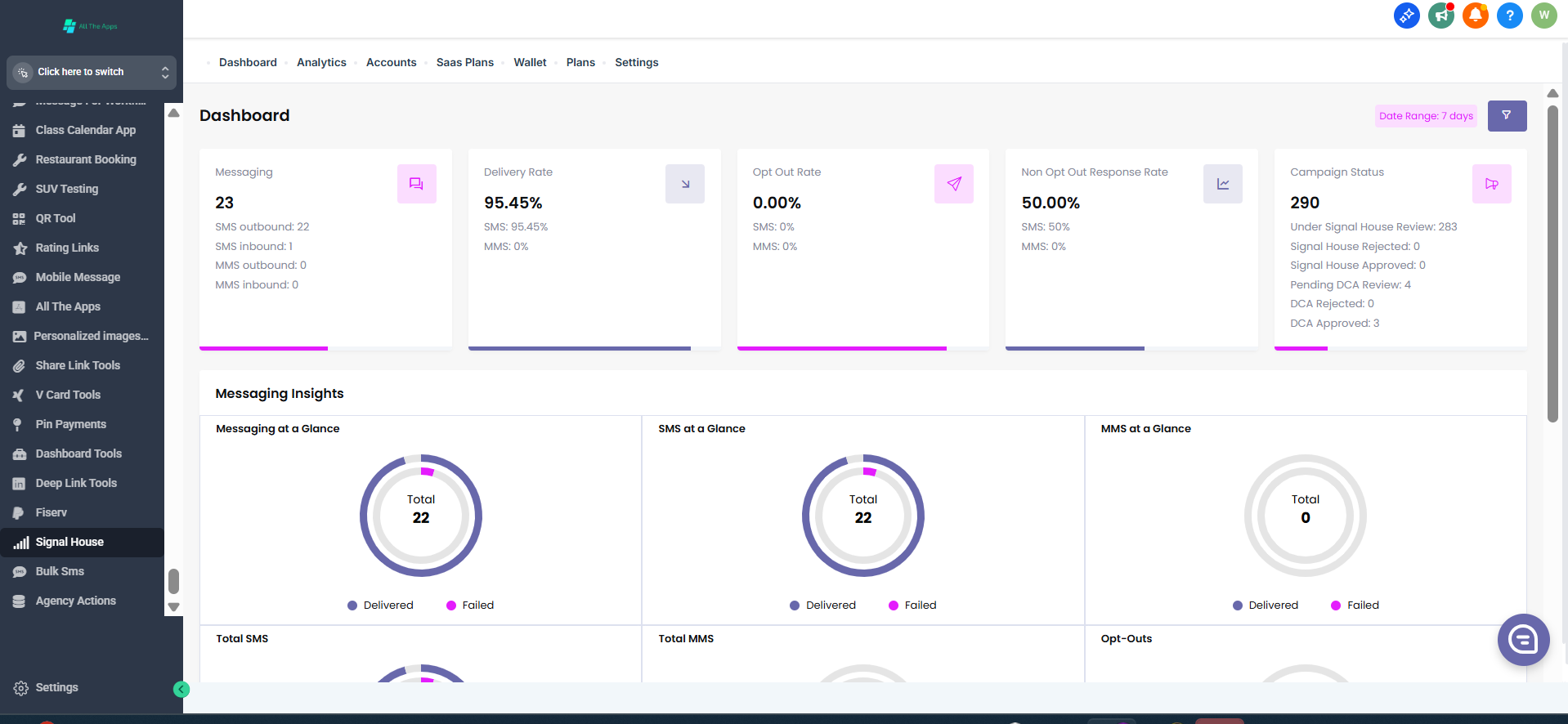 Whether you're an agency managing multiple clients or a business with various brands, Signal Houseโs GHL App allows you to seamlessly manage all your Subaccounts and track their messaging activity from one place.