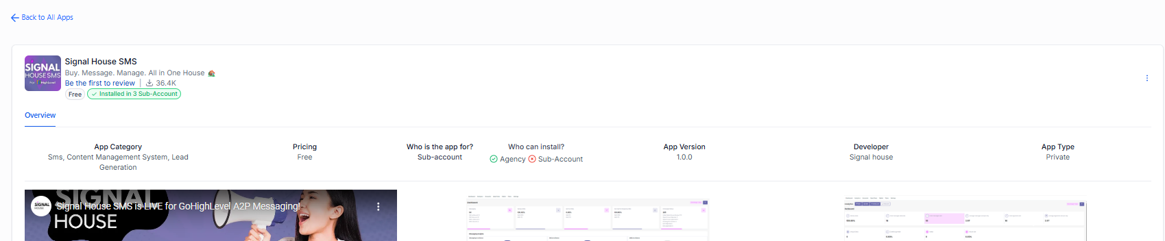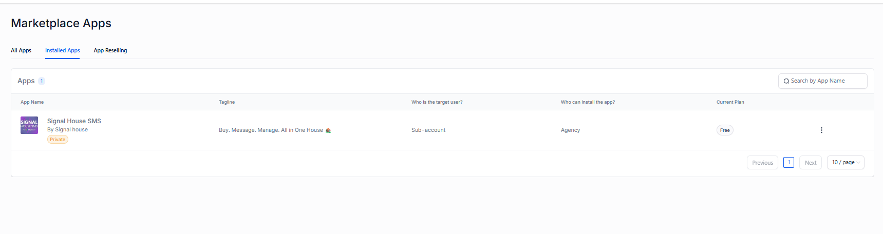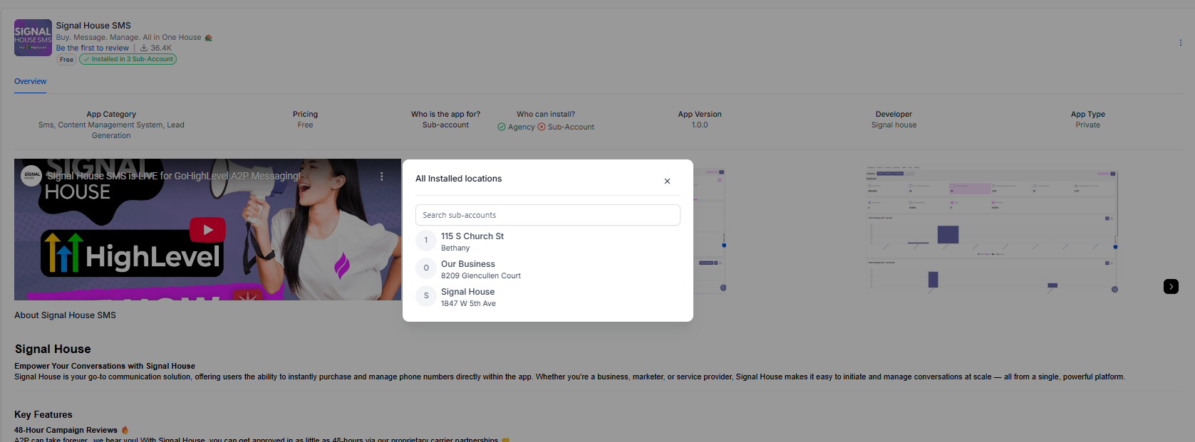 This guide will walk you through how to install the SignalHouse App into any of your GoHighLevel sub-accounts after it's been installed in your main agency account.
