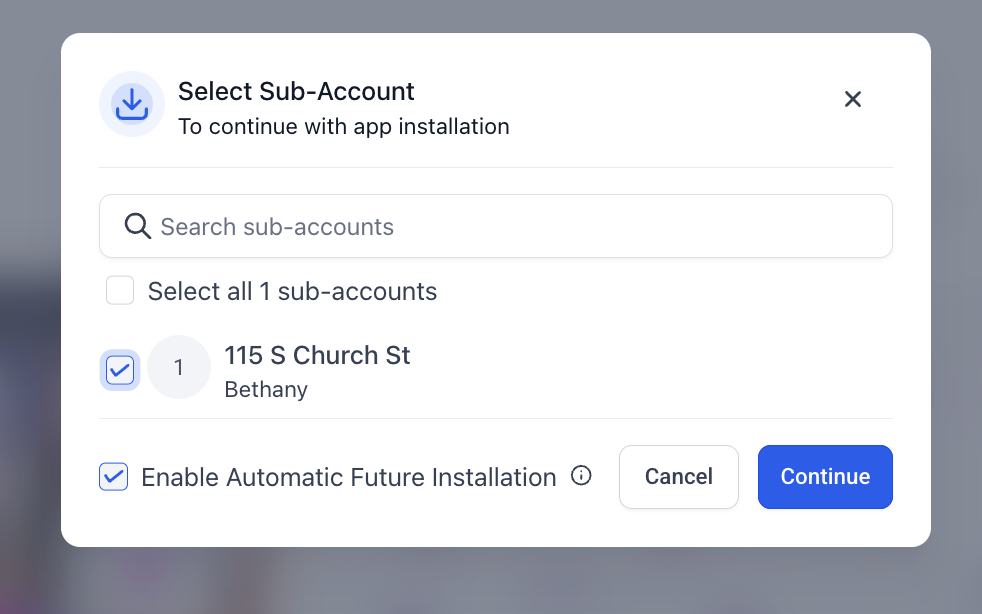 Press Continue → Allow and Install and a new pop up will appear which means your app is installed in the sub account.