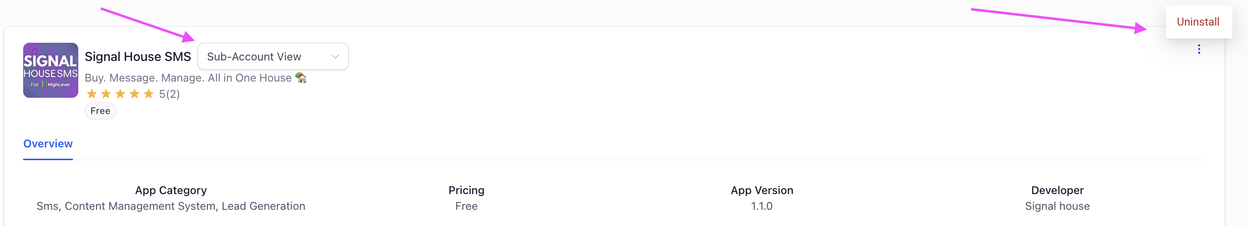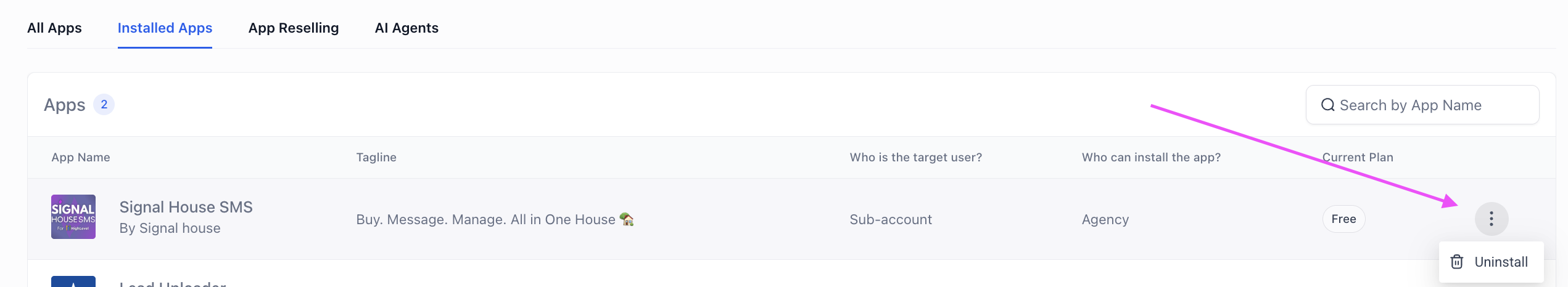 5.Once the app is uninstalled, switch back to the agency view → App Marketplace Installed Apps → Click on Signal House app.