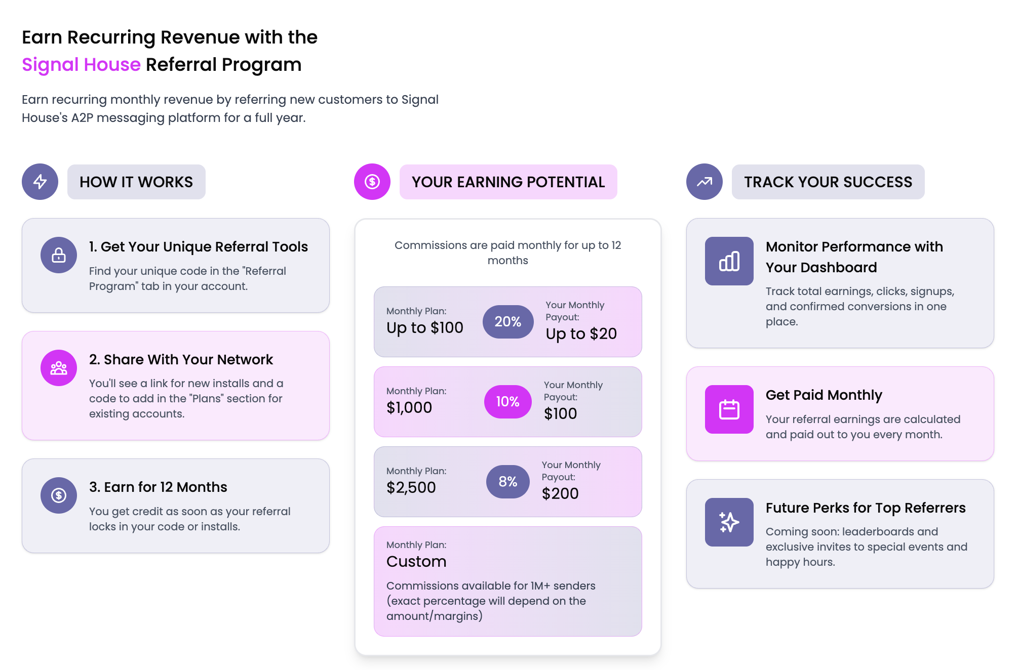 The referral infographic is designed to give you a quick, visual overview of how referrals move through Signal House — from sharing your link to earning recurring commissions.